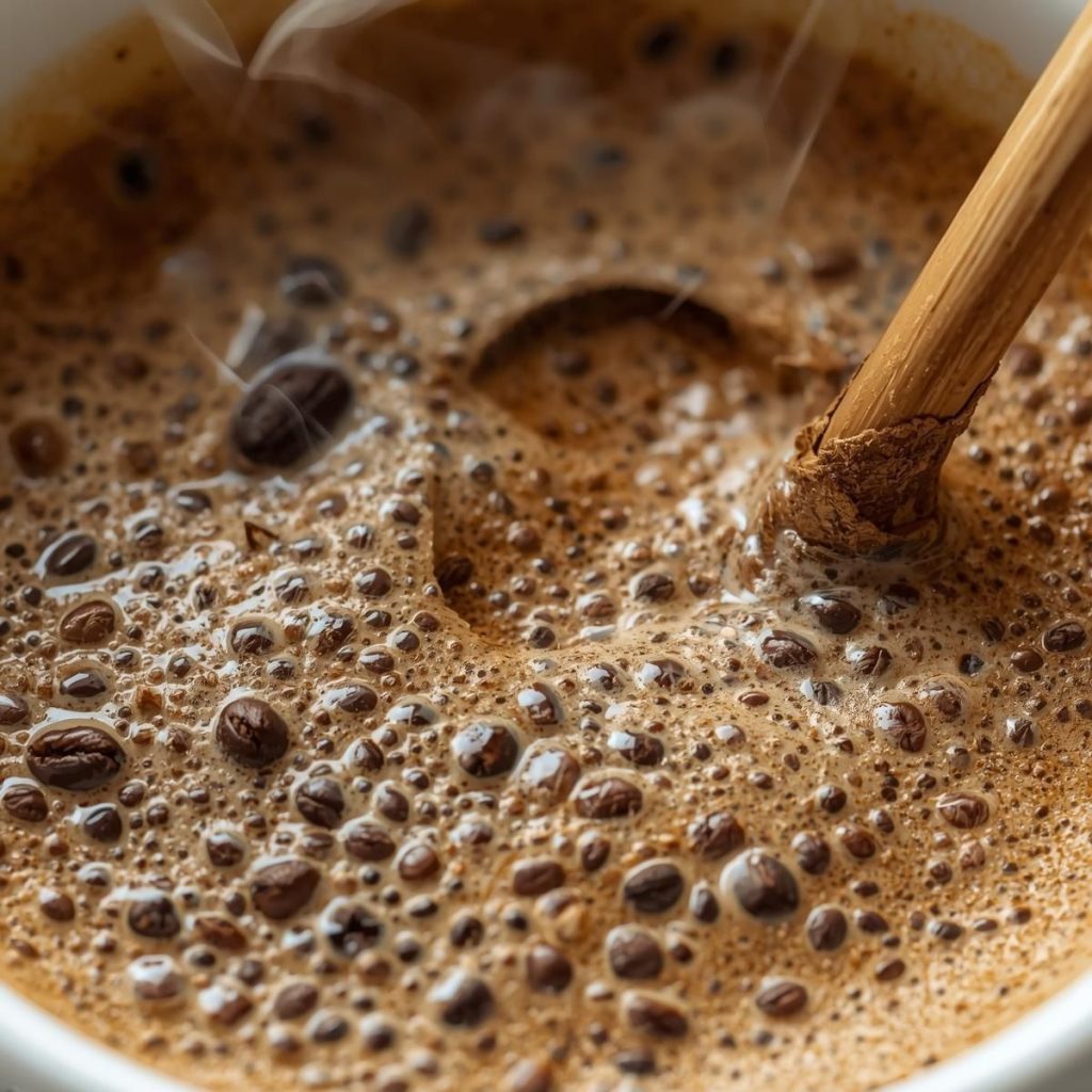 Gently stir the grounds with a spoon or chopstick to break up dry spots and ensure full saturation. Even coverage means steady strength and a cleaner flavor.